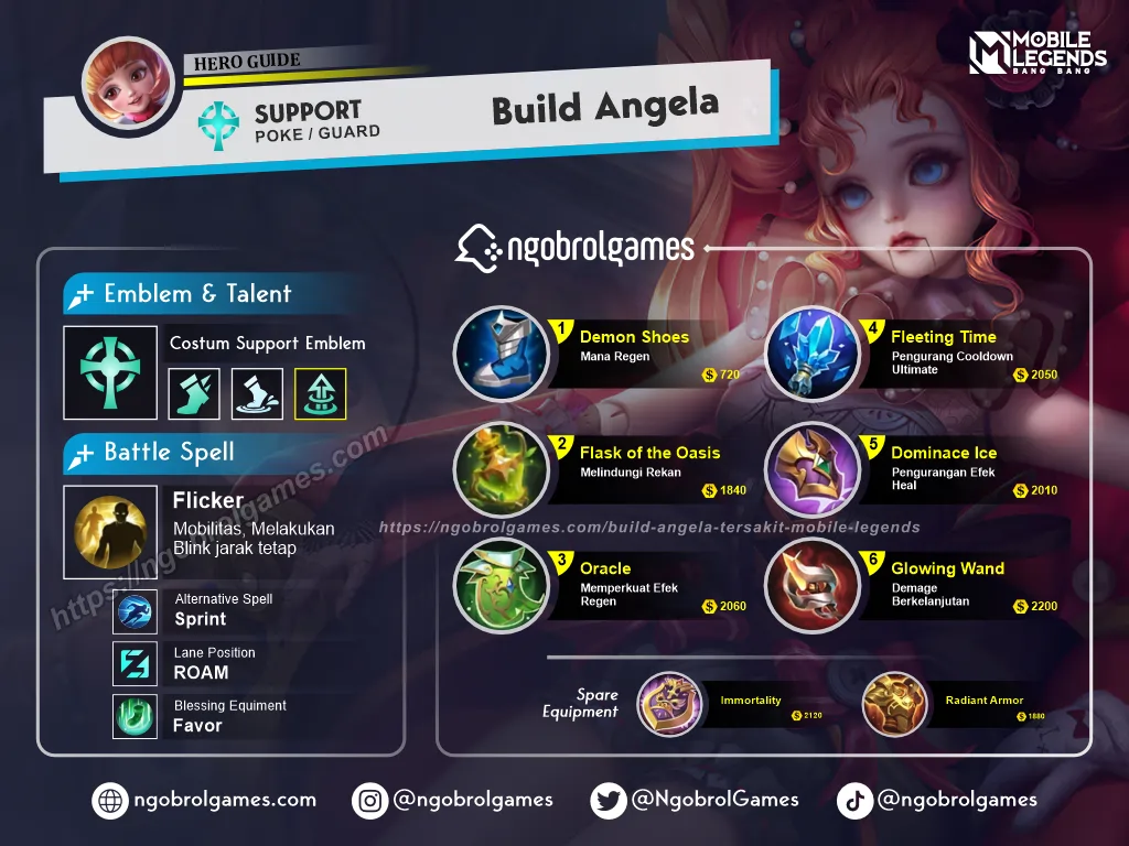 Build Angela yang sering dipakai oleh top global 1-10 teratas pada season ini. build ini menduduki peringkat teratas sebagai build Angela paling populer dan sering digunakan di mode ranked.
