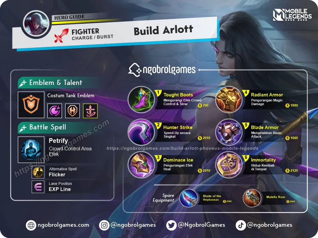 Build Arlott yang sering dipakai oleh top global teratas pada season ini. build ini menduduki peringkat teratas sebagai build Arlott paling populer dan sering digunakan di mode ranked oleh pro player.