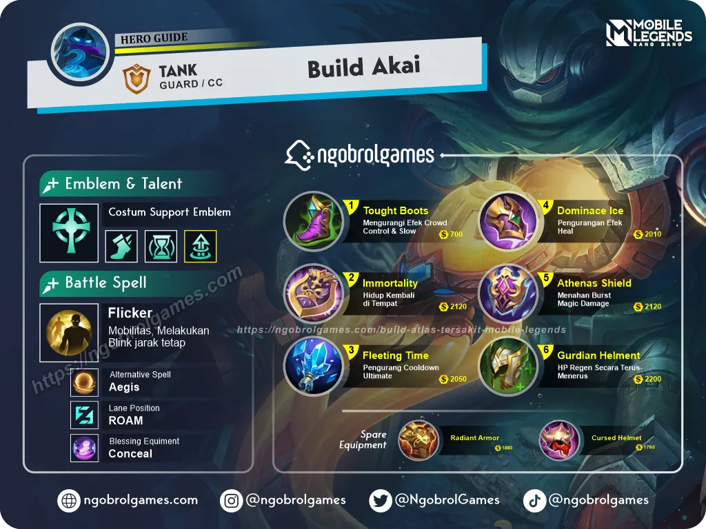 Atlas sangat baik dalam hal mobilitas dan durabilitas, hero ini mampu mensupport tim dengan baik di depan atau pun hero untuk membuka war. Agar tidak cepat mati, berikut susunan item yang ideal digunakan.