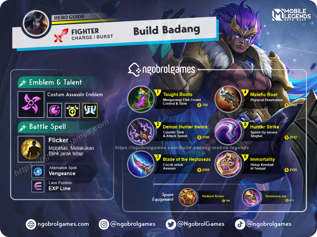 Build Badang yang sering dipakai oleh top global 1-10 teratas pada season ini. build ini menduduki peringkat teratas sebagai build Badang paling populer dan sering digunakan di mode ranked oleh pro player.