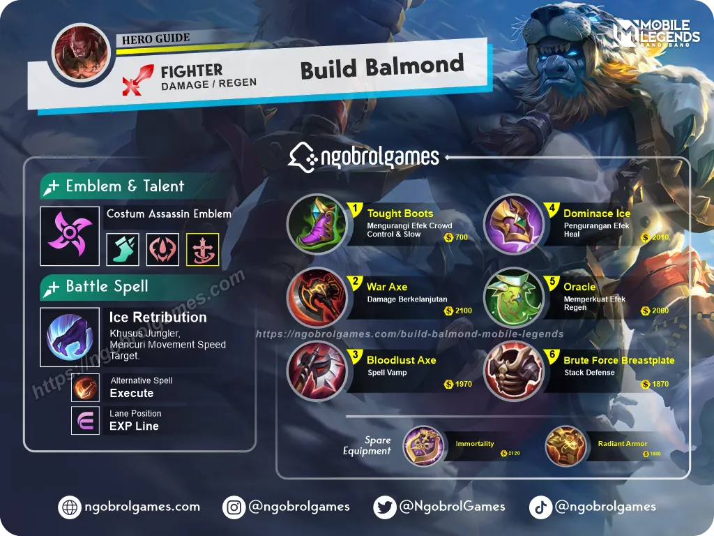 Build Balmond yang sering dipakai oleh top global 1-10 teratas pada season ini. build ini menduduki peringkat teratas sebagai build Balmond paling populer dan sering digunakan di mode ranked oleh pro player.