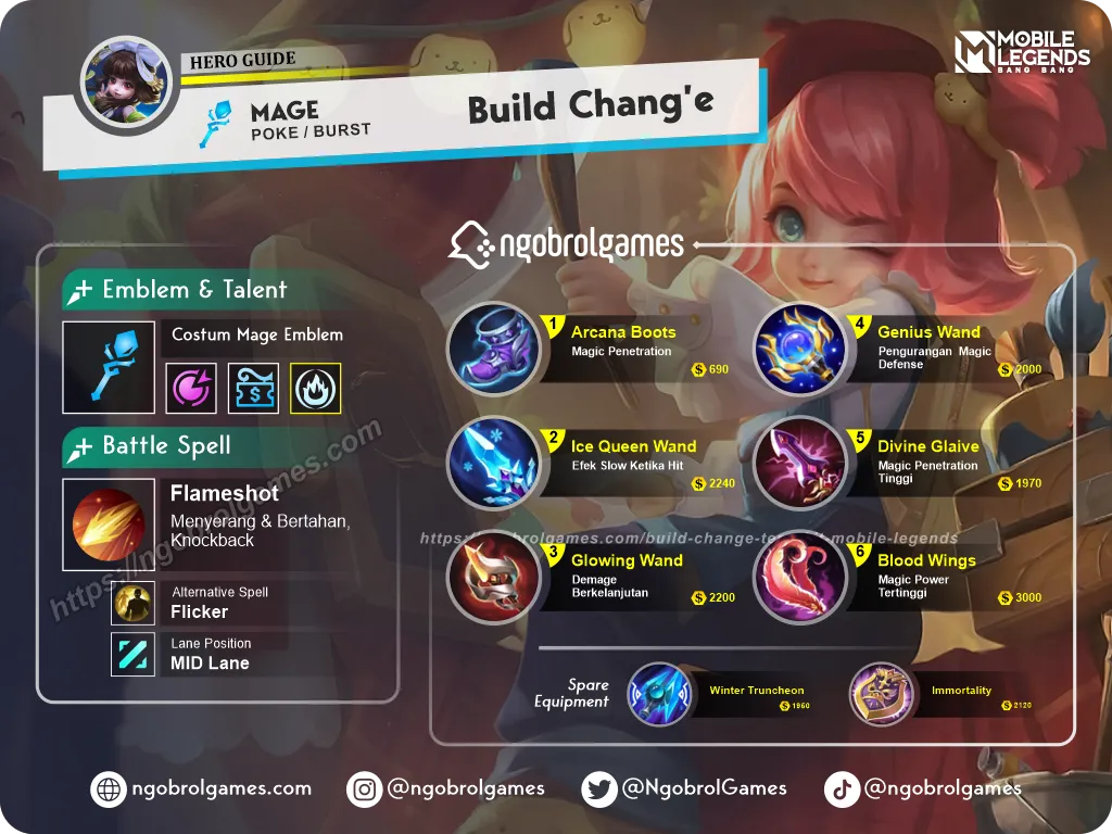 Build Chang’e yang sering dipakai oleh top global 1-10 teratas pada season ini. build ini menduduki peringkat teratas sebagai build Chang’e paling populer dan sering digunakan di mode ranked oleh pro player.
