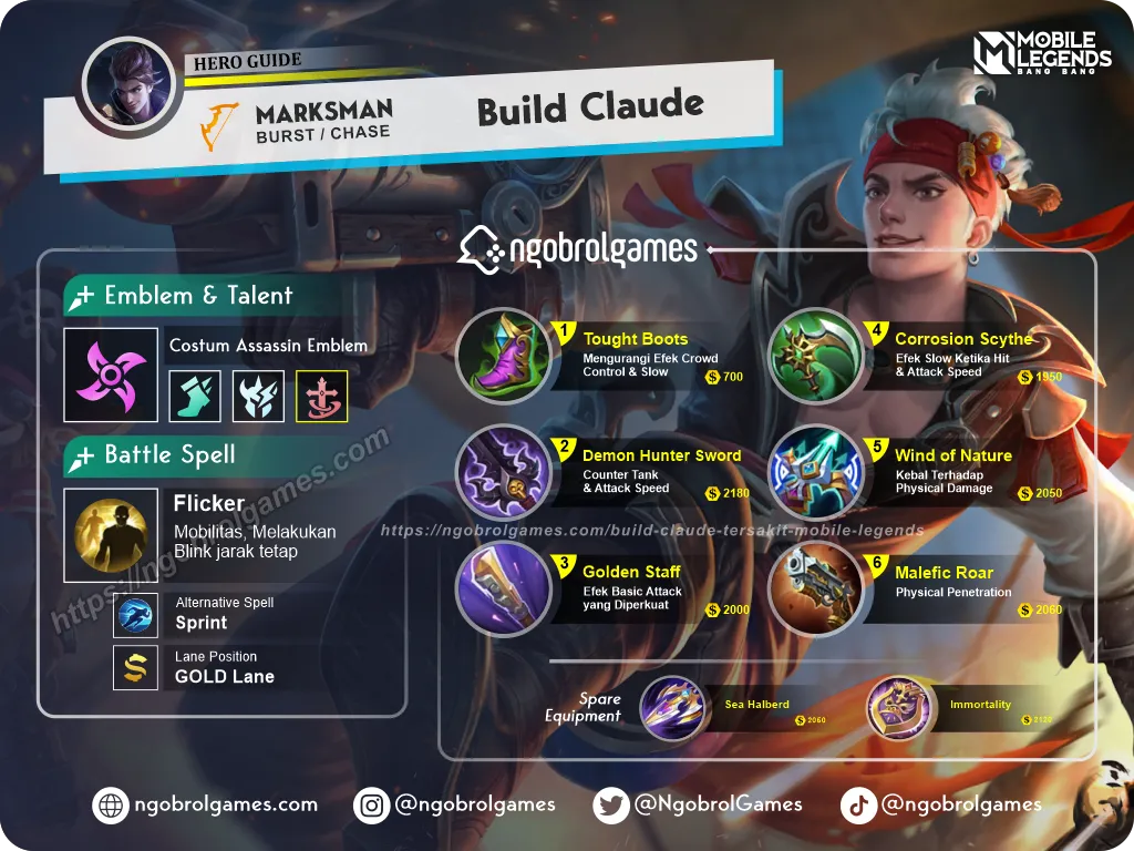 Build ini adalah build Claude yang cukup sering digunakan oleh Skylar baik itu ketika live straming tau senang berkompetisi, build ini fokus pada damage yang tinggi, untuk kalian yang ingin mengeliminasi hero musuh dengan cepat sekali serang mungkin bisa menggunakan build ini.