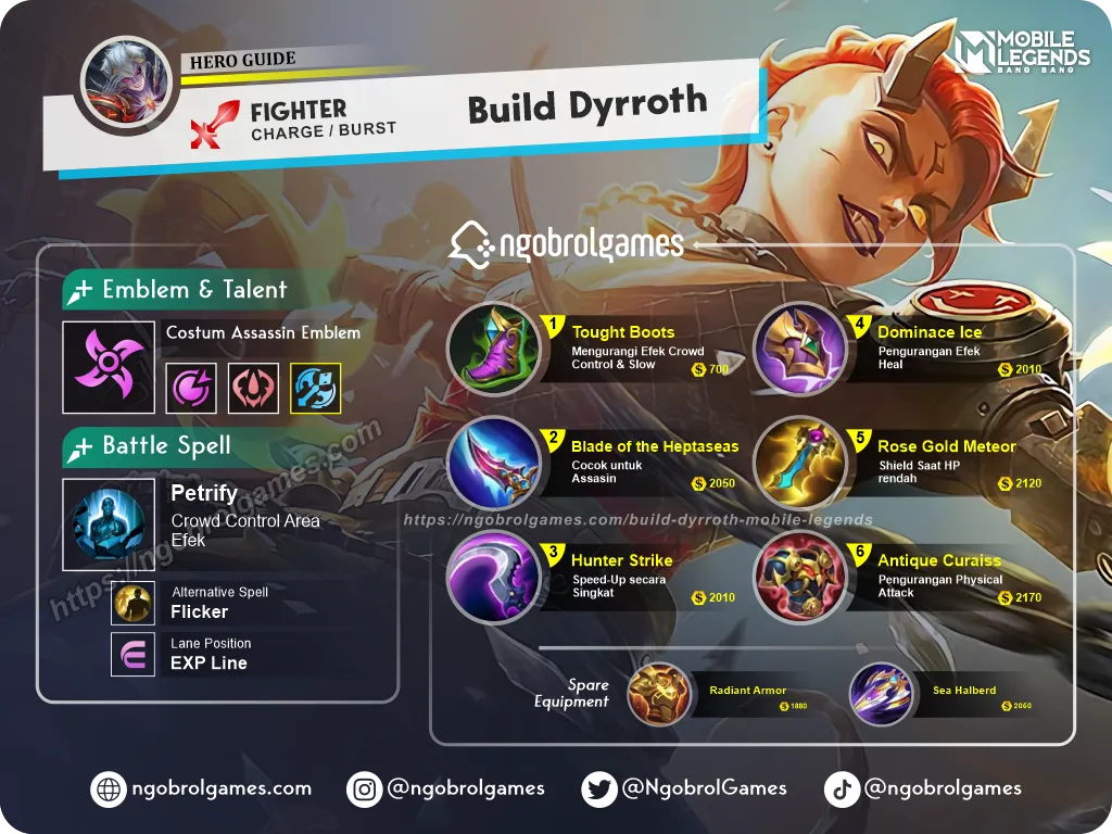 Build Dyrroth yang sering dipakai oleh top global 1-10 teratas pada season ini. build ini menduduki peringkat teratas sebagai build Dyrroth paling populer dan sering digunakan di mode ranked oleh pro player.