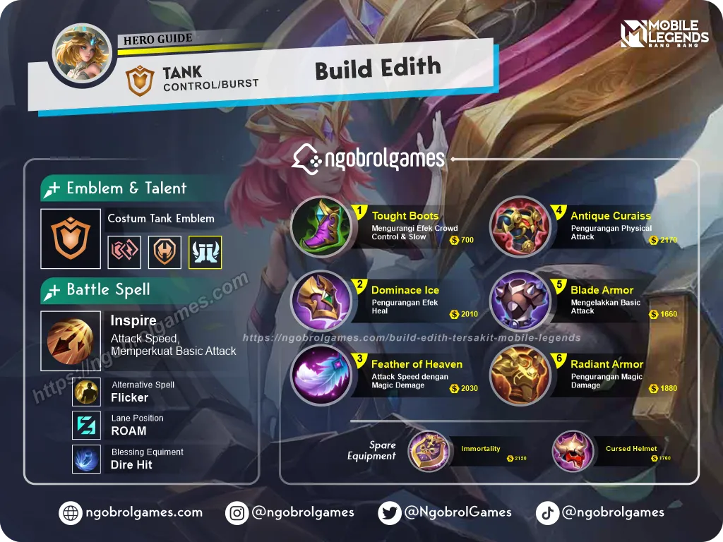 Seperti pada pembahsan di atas, edit merupakan hero yang sangat kuat dan tebal layaknya tank pada umumnya, hanya saja dia memiliki kelebihan pada ultimatenya dima ia dapat meningkatkan attack speed nya dengan sangat signifikan, sehingga untuk memaksimalkan potensi tersebut battle spell inspire sangat ideal untuk digunakan.
