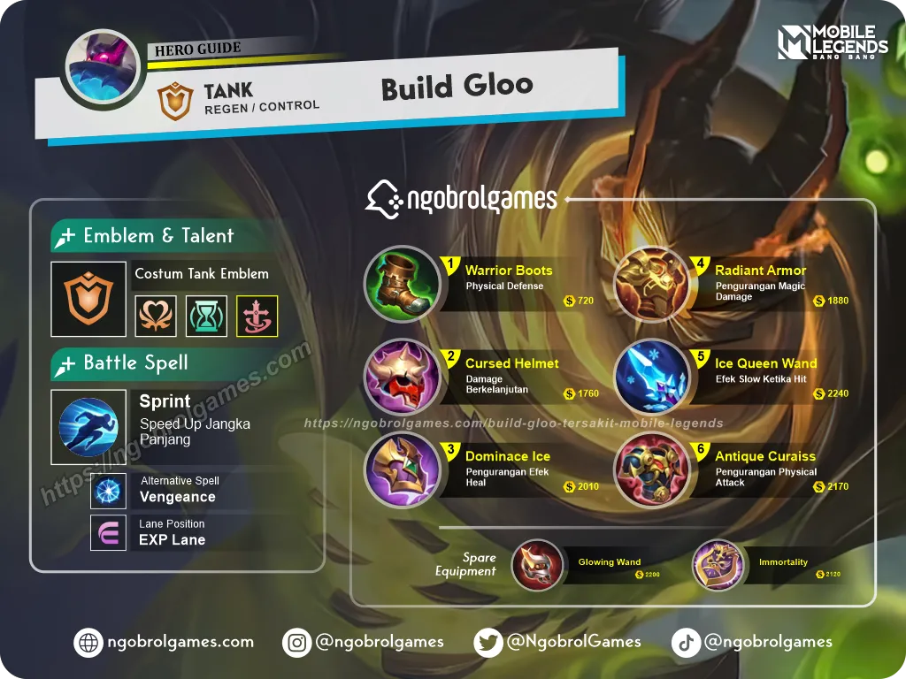Dari ulasan singkat di atas bisa dipastika jika Gloo pasti akan menjadi sasaran atau target serang dari unit hero lawan, maka dari itu Gloo benar-benar membutuhkan pertahanan yang kuat baik itu dengan Physical atau Megical Penetration atau Efek Regen yang diterima dari Build nya, Penasaran dengan Build Gloo Tersakit versi kami, Berikut adalah Build Gloo Tersakit dan Paling Mematikan yang sering digunakan oleh para Pro Player.