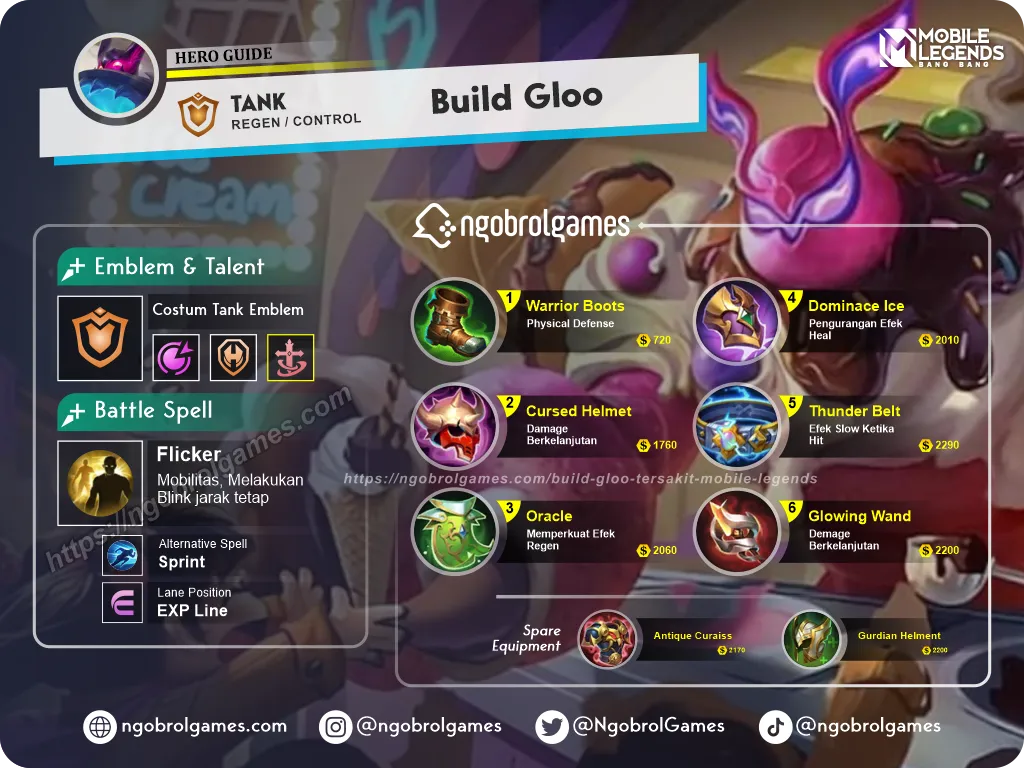 Jika kalian bermain gloo di exp lane, build ini bisa kalian coba. kombinasi emblem support, spell execute dan susunan item defense membuat gloo cukup baik dalam bertahan sambil melakukan poke terhadap lawan dan memanfaatkan execute sebagai pengakhir.