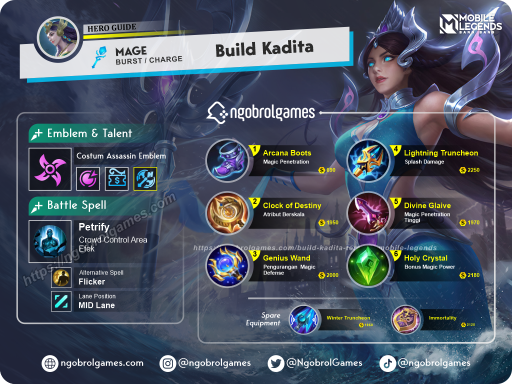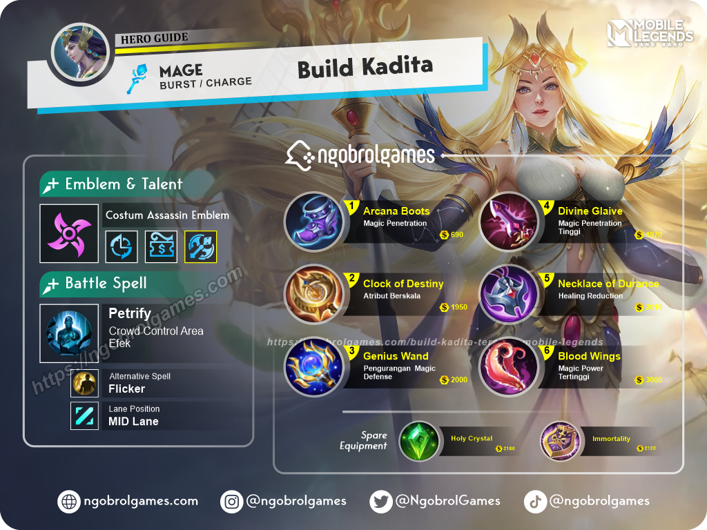 Build Kadita yang sering dipakai oleh top global 1-10 teratas pada season ini. build ini menduduki peringkat teratas sebagai build Kadita paling populer dan sering digunakan di mode ranked oleh pro player.