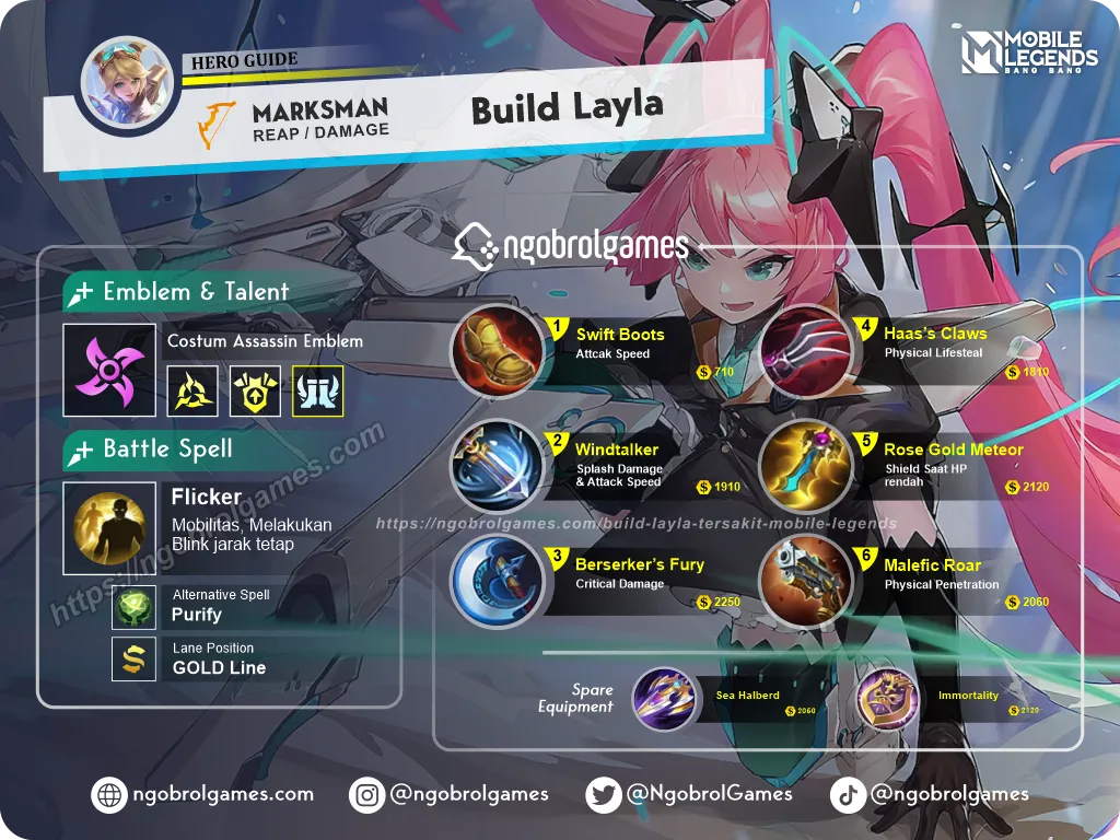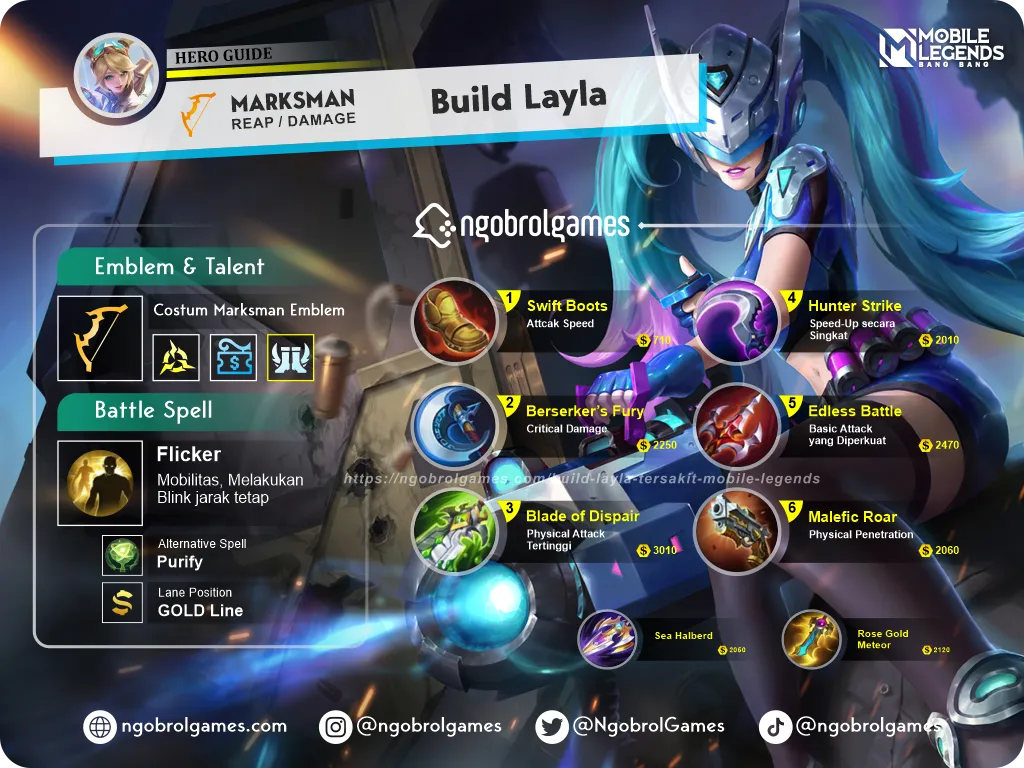 Layla merupakan salah satu Hero Marksman Tersakit di late game, sebagai hero marksman yang memiliki peran penting saat war, kombinasi build item yang benar akan menghasilkan damage yang maksimal sehingga membuatnya sangat mematikan, dan jika beruntung, kamu bisa mendapatkan savage.