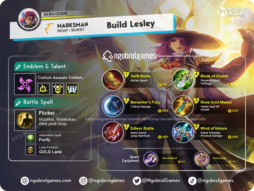 Demikianlah sedikit ulasan tentang Build Lesley Tersakit 2024 Mobile Legends sebagai hero marksman yang mungkin sering dihina jika dipick dirank, namun memiliki damage yang besar jika pandai memainkannya.