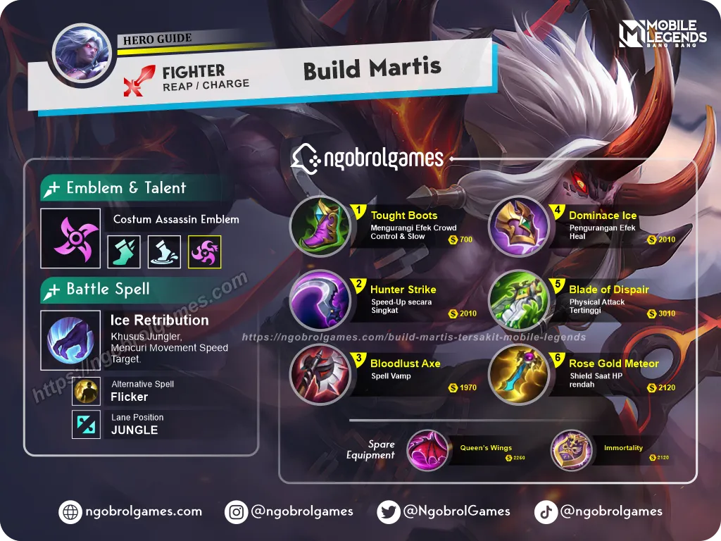 Build Martis yang sering dipakai oleh top global 1-10 teratas pada season ini. build ini menduduki peringkat teratas sebagai build Martis paling populer dan sering digunakan di mode ranked oleh pro player.