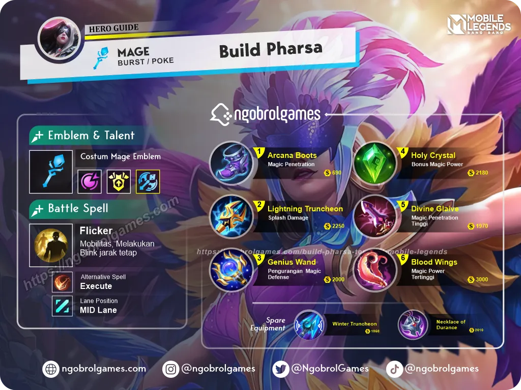 Build Pharsa yang sering dipakai oleh top global 1-10 teratas pada season ini. build ini menduduki peringkat teratas sebagai build Pharsa paling populer dan sering digunakan di mode ranked oleh pro player maupun pada turnament M4.