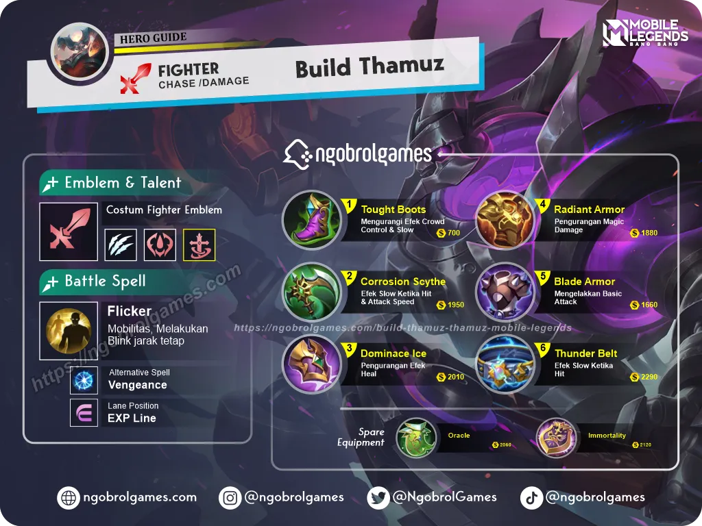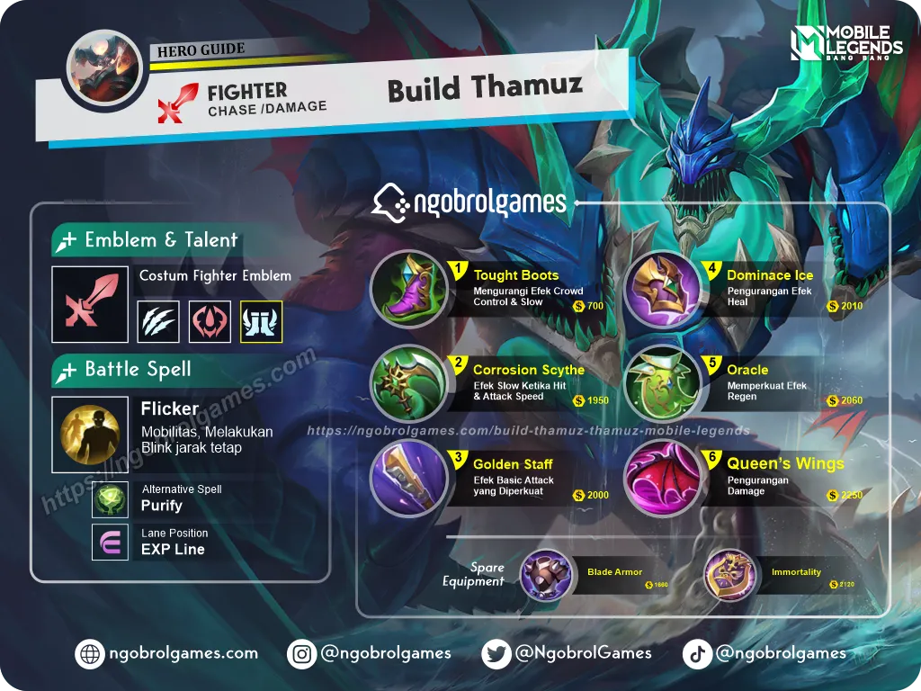Build Thamuz yang sering dipakai oleh top global 1-10 teratas pada season ini. build ini menduduki peringkat teratas sebagai build Thamuz paling populer dan sering digunakan di mode ranked oleh pro player.