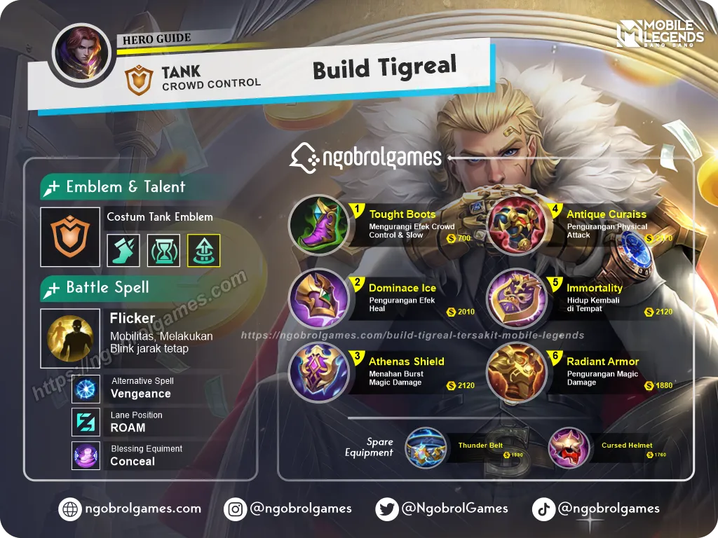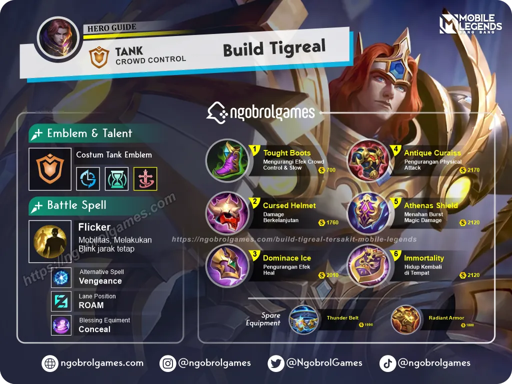 Build Tigreal yang sering dipakai oleh top global 1-10 teratas pada season ini. build ini menduduki peringkat teratas sebagai build Tigreal paling populer dan sering digunakan di mode ranked oleh pro player.