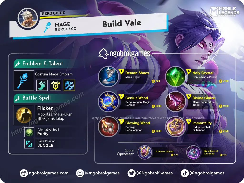 Build Vale yang sering dipakai oleh top global 1-10 teratas pada season ini. build ini menduduki peringkat teratas sebagai build Vale paling populer dan sering digunakan di mode ranked oleh pro player.